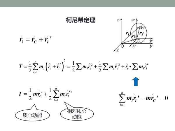 这是一道复杂的流体力学的问题,我们可以将其视为一道质点系的问题求解。经分析很容易得到,注水球回弹高度取决于与地面碰撞以后质心的运动速度,即与质心动能相关。解决这个问题,可以用克尼希定理来解释。教师引引出克尼希定理并进行介绍,给出惯性系下动能与质心系下动能的关系。
