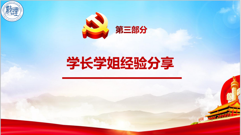 在经验交流分享环节,2016级五位不同专业考研成功的员工分享了他们的考研心得。他们简要介绍自己考取院校专业的招录情况,指导学弟学妹们如何确立考研目标,并阐明坚持目标的重要性。戴兴龙十分强调时间管理,他说“在时间规划方面尤其要切记,制定合理的复习计划,高效备考,及时调整节奏并坚持下去,不要与他人攀比,要踏踏实实,严格推进备考进程。”此外,范静怡、王康、冯晓鸥和于智乾四位同学分别在对信息查询、备考资料、重要方法、平稳心态等方面介绍了自身经验,强调掌握有效获取途径用好微信公众号、中国大学慕课、B站、考研QQ群等互联网资源,鼓励同学们在考研路上坚定信念,勇往直前。
