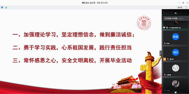 在即将迎来中国共产党建党99周年前夕,6月24日,yl23455永利在线上腾讯会议开展了毕业班员工党员离校教育暨党员廉洁诚信专题教育。公司党委副书记叶华刚、专职组织员吕莹、信物本科生低年级党支部书记刘紫薇、毕业班辅导员康鸿轩及全体毕业生党员参加会议。