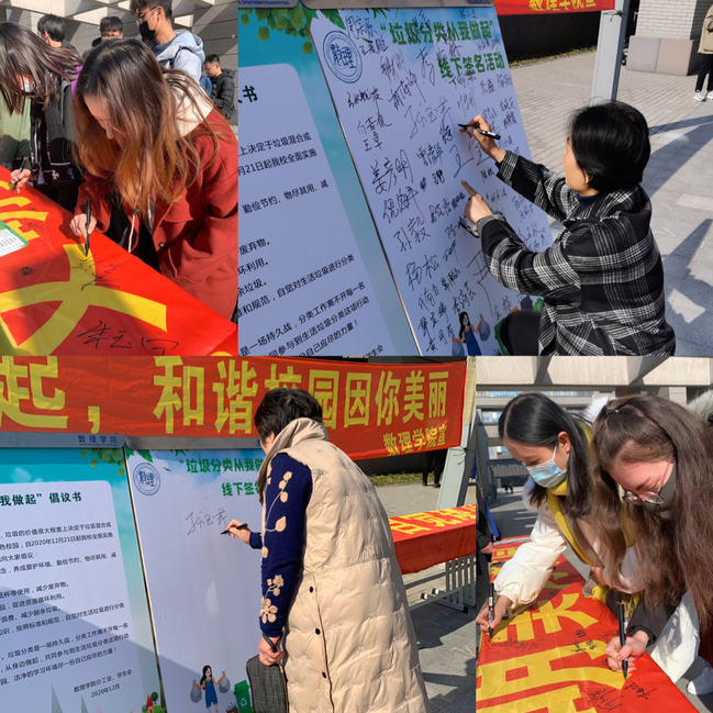 活动中公司志愿者为前来参加活动的同学发放《垃圾分类宣传手册》,详细向同学们介绍公司垃圾定点投放的地点、时间,如何在寝室做好垃圾分类等。公司老师、同学及志愿者纷纷在“倡议书”签名板上签名。