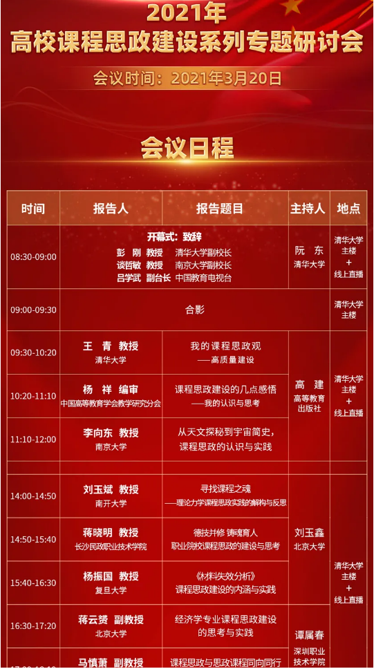 南京大学李向东教授从天文探秘到宇宙简史谈论了课程思政的认识与实践;南开大学刘玉斌教授从理论力学课程思政实践的解构与反思谈论了寻找课程之魂;复旦大学杨镇国教授从《材料失效分析》课程分享了他对课程思政的思考;北京大学蒋云赟副教授从经济学角度谈论了课程思政建设,中国人民大学马慎萧副教授、长沙民政职业技术公司蒋晓明从他们丰富的教学经验出发分享了他们对课程思政的思考和实践经验。