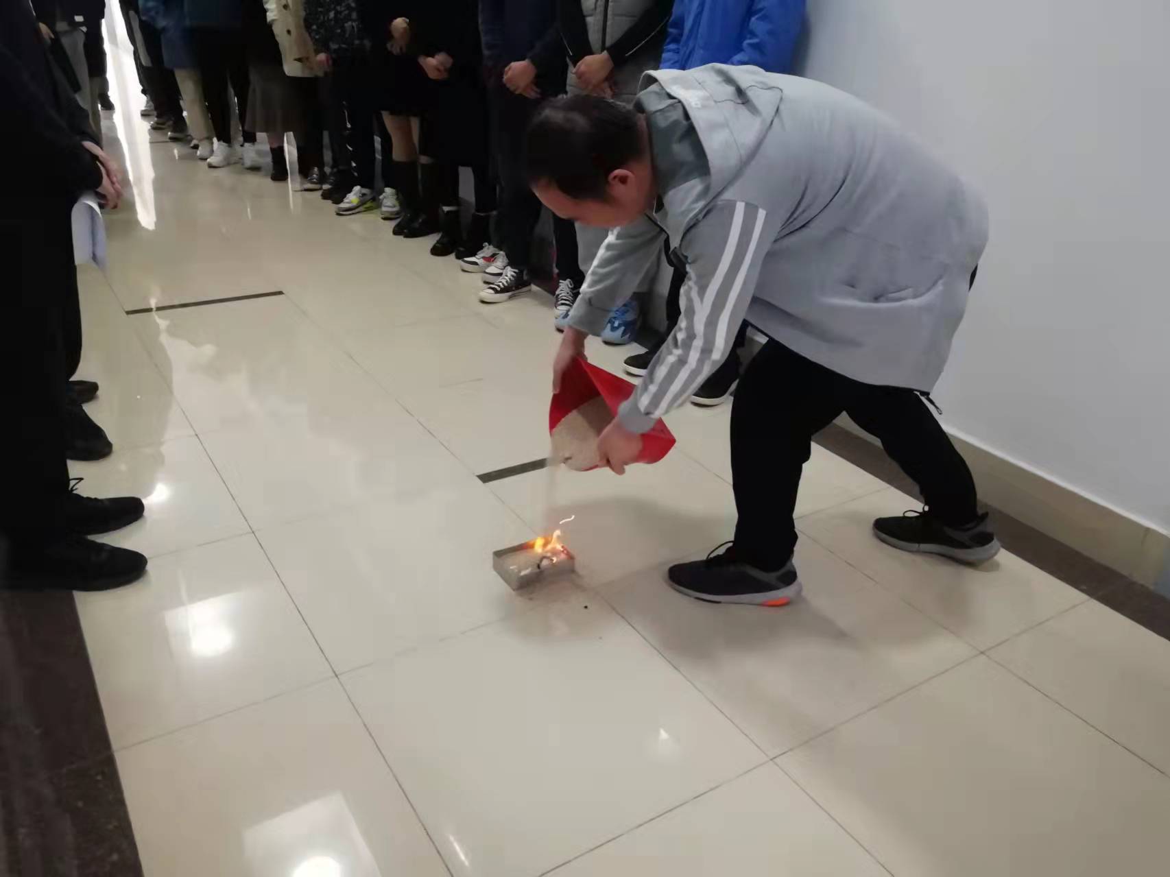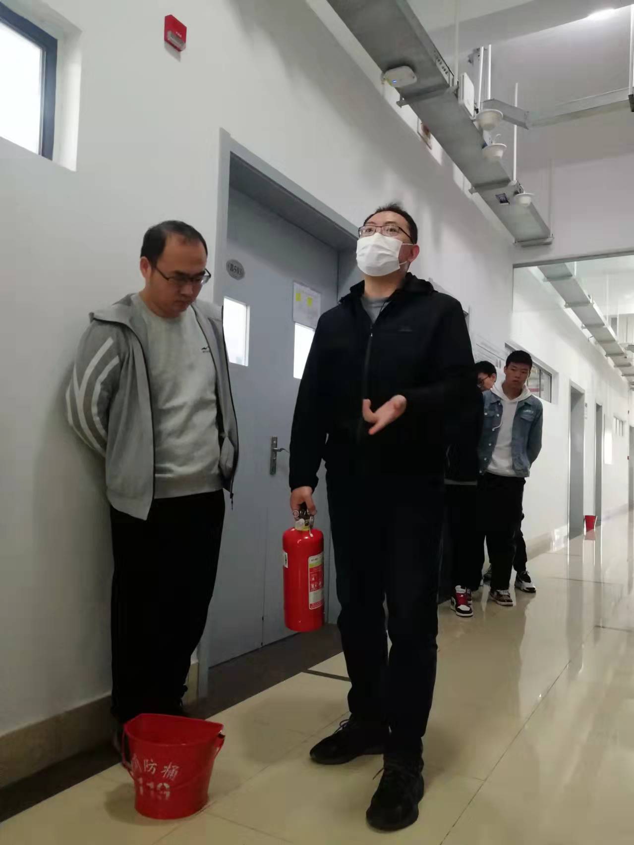 演练场景2:数理楼B503实验室,员工在做加热实验时,由于温度过高,造成局部发生了小面积着火,员工开展自救行动,立即用一楼楼道中的沙桶将火扑灭。同时,同组员工第一时间也联系到自己的导师,导师立即赶到现场进行处理。