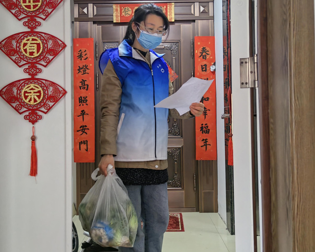在小区开展全员抗原检测期间,佟老师被安排负责本楼栋人员抗原试剂盒的发放和回收,以及检测后的数据采集工作。她穿着防护服,每天早上7:00挨家挨户分发检测工具并耐心讲述试剂盒的操作流程,尤其对一些独自在家、自理能力较差的老人更是提供了非常细致的讲解和帮助。待居民们抗原检测完成后她再上门回收试剂盒,防止出现社区间交叉感染,并将最终结果反馈给居委会。“虽然工作琐碎且辛苦,但只要想到能和其他志愿者们一起为社区居民们提供帮助,看到他们脸上的笑容,我就觉得这份工作是有意义的。”