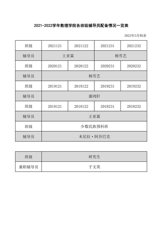 2021-2022学年yl23455永利各班级辅导员配备情况一览表